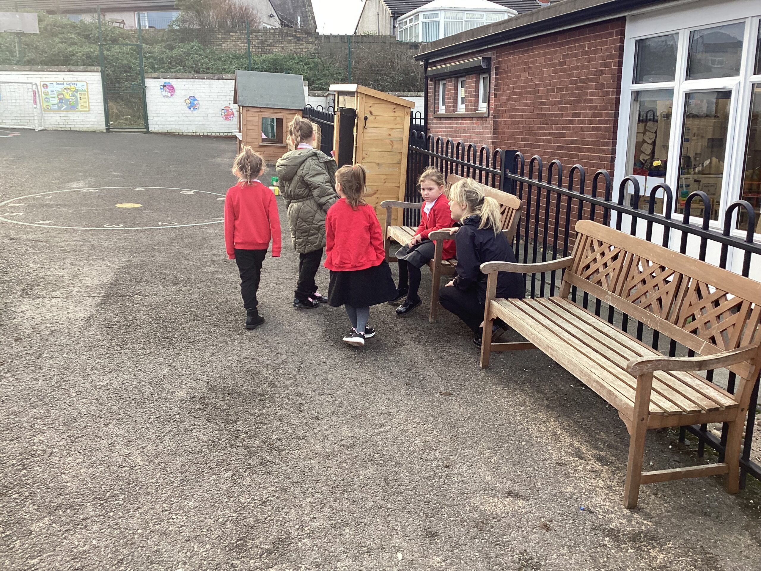 🍎 Some of our children were pausing to have a piece of fruit and a chat by the benches.