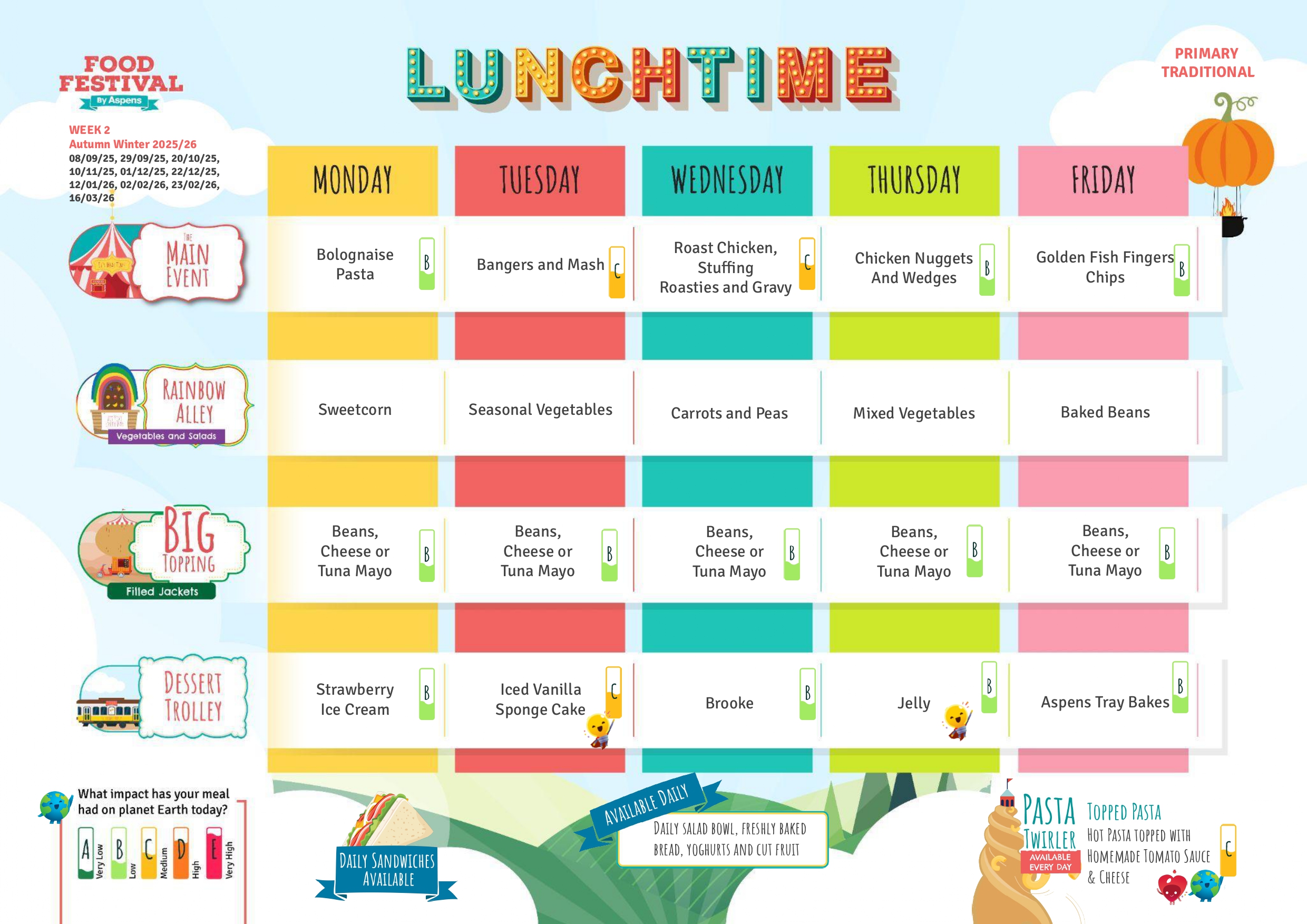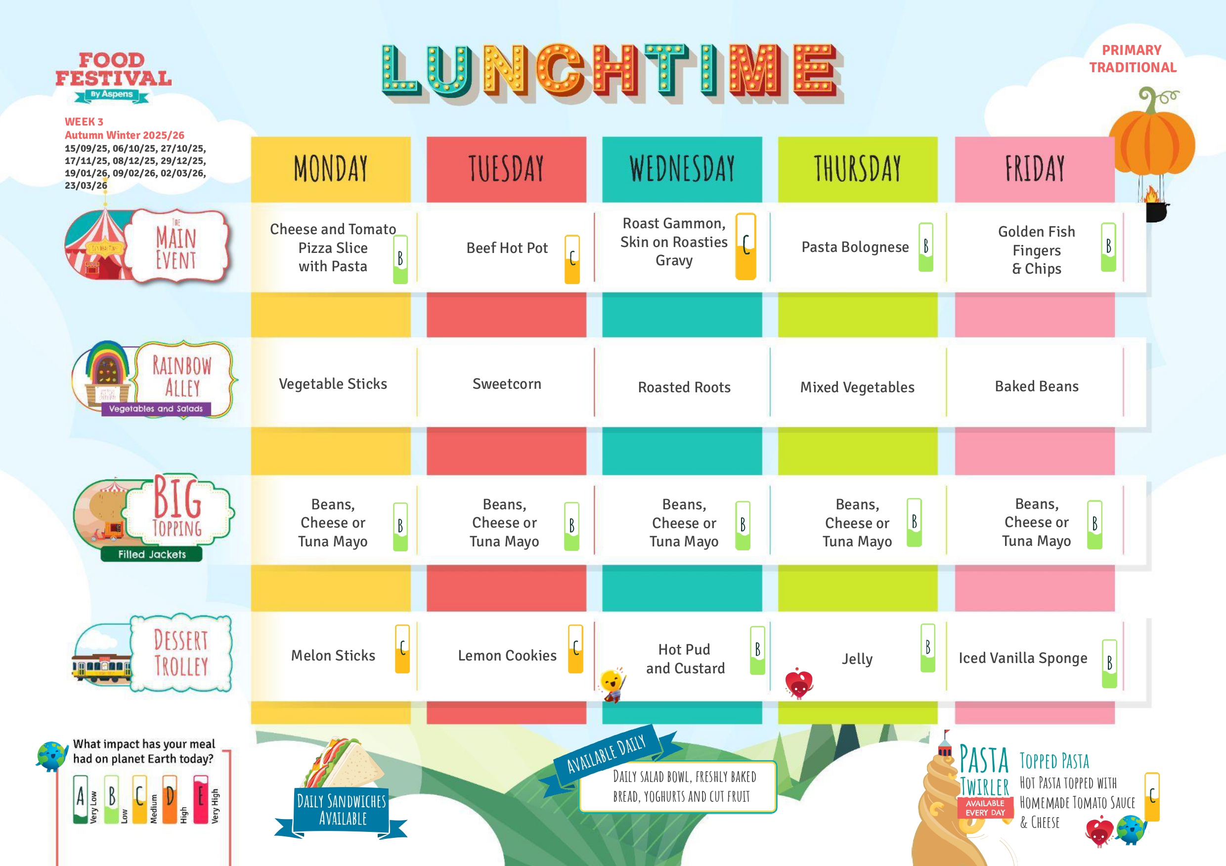 Please see below our menus, these menus change on a weekly basis over three weeks.